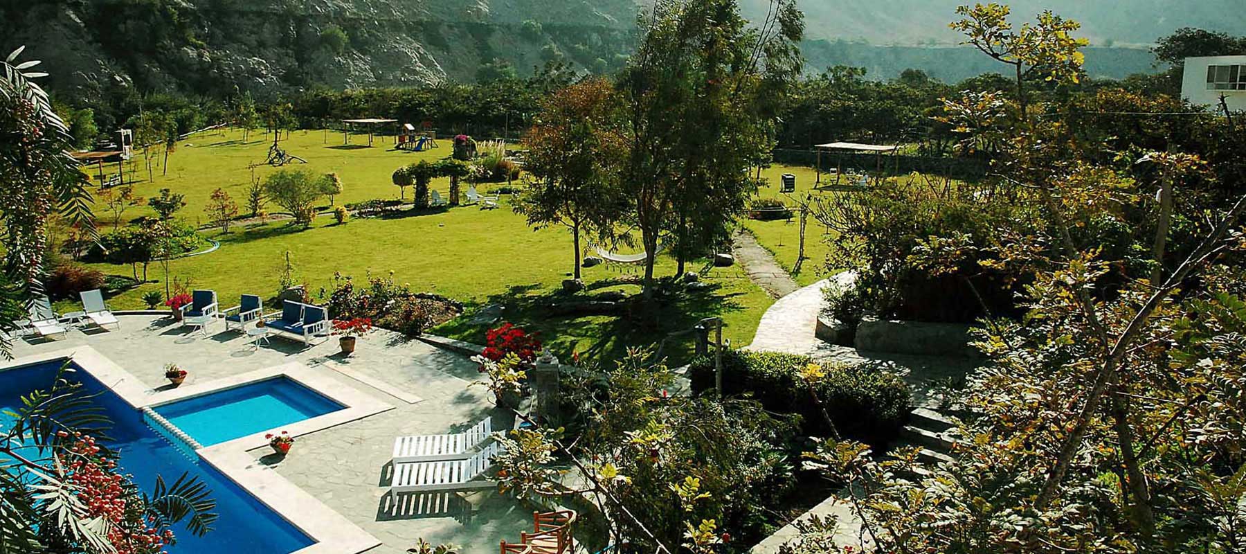 Está rodeado por 2 hectáreas de hermosos jardines y viñedos, junto a la rivera del río Cañete, con su playita natural. Hay una sala con biblioteca y chimenea, buena música, piscina de diseñador, restaurante, y zona de fogata.